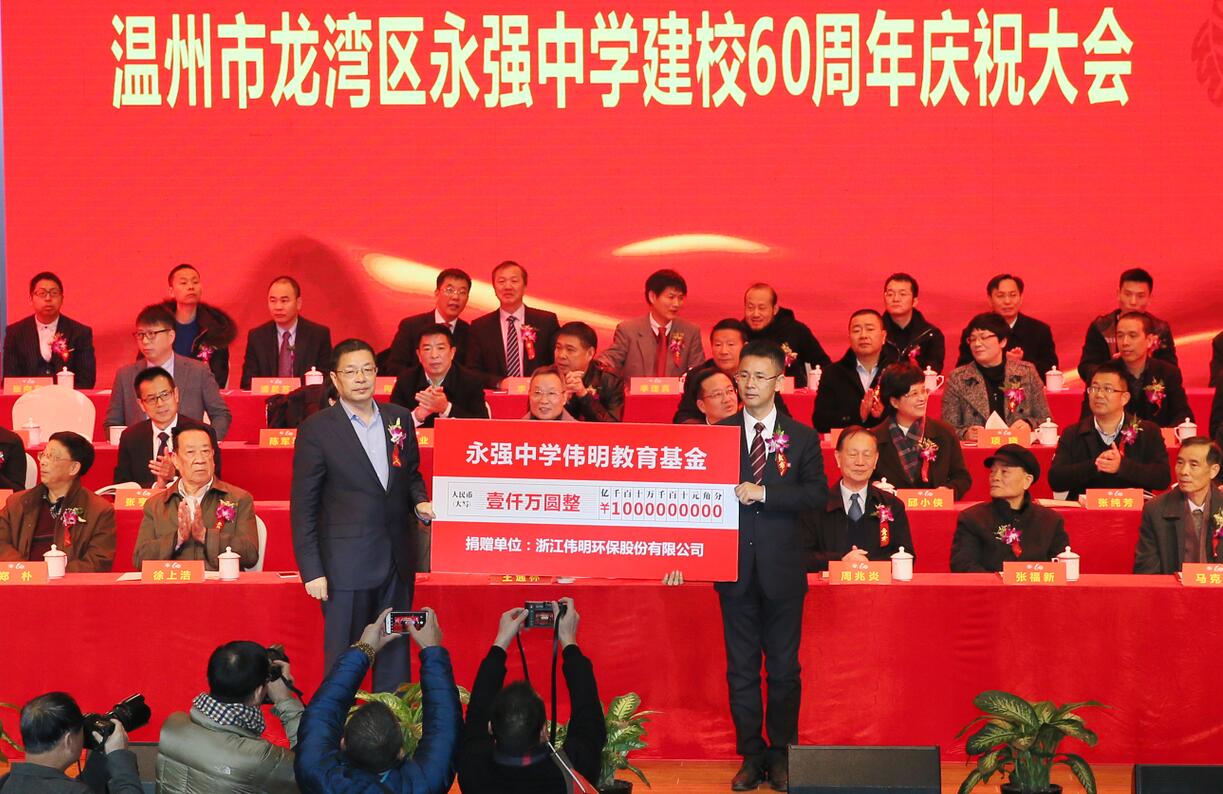 The 60th anniversary of Yongqiang Secondary School was celebrated on December 17, for which purpose Weiming Environment Protection particularly set up 10-million Yuan education fund for Yongqiang Secondary School. At the ceremony, President Xiang Guangming handed the donation card to Mr. Chen Liang, Principal of Yongqiang Secondary School.