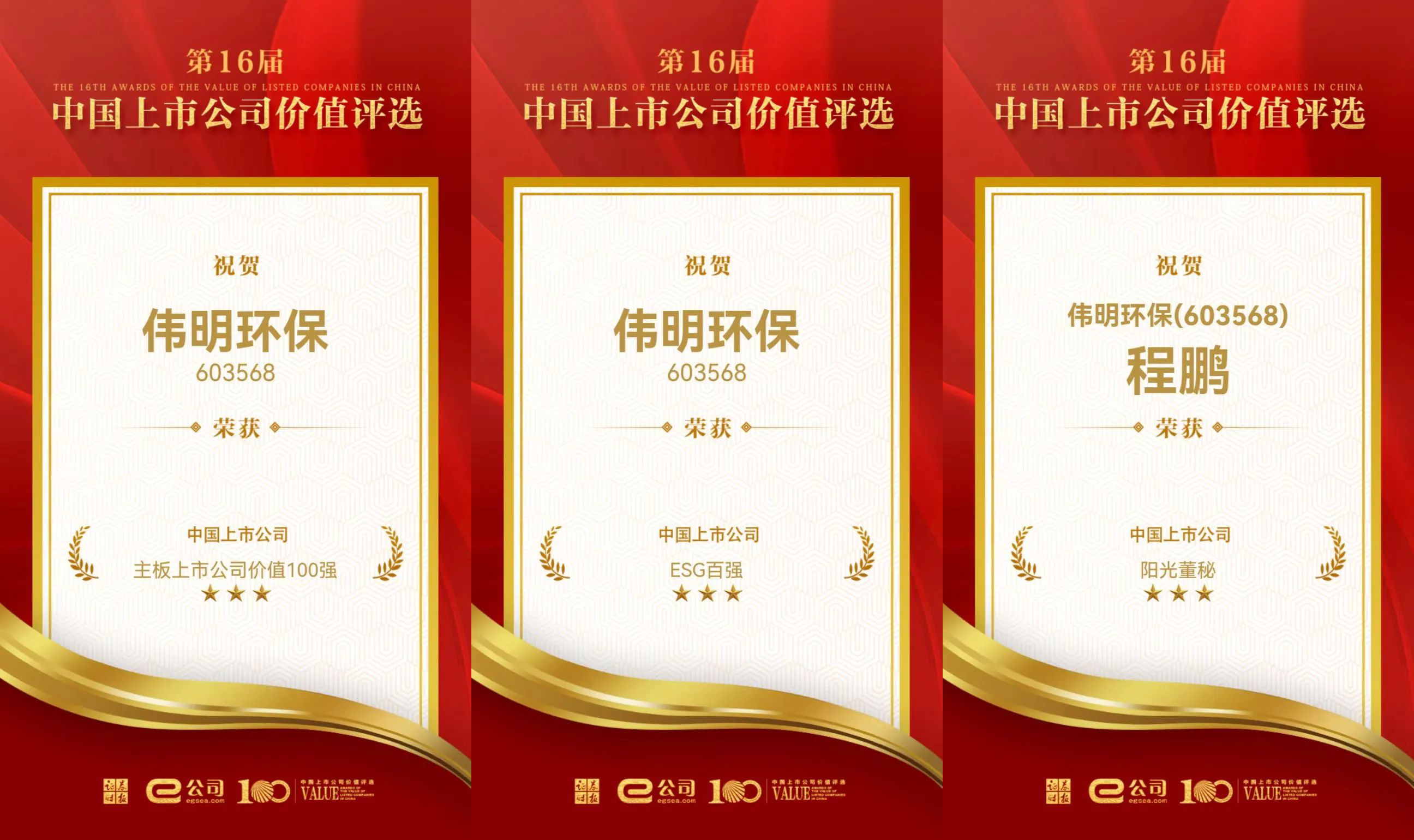 On September 22, the 16th China Listed Companies Value Awards, hosted by Securities Times, announced its winners. Weiming Environment Protection was honored with two prestigious awards—“Top 100 Most Valuable Mainboard Listed Companies” and “Top 100 ESG Leaders Among China’s Listed Companies”—in recognition of its robust core business, outstanding profitability, innovation-driven R&D, and strong social responsibility. Additionally, Cheng Peng, Secretary of the Board, was awarded “Sunshine Board Secretary of Listed Companies”.