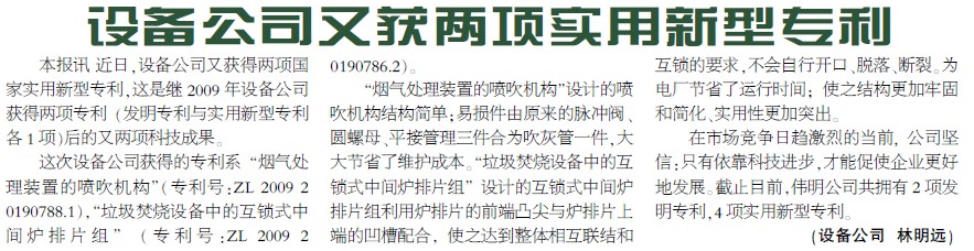 设备公司又获两项实用新型专利