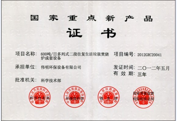本报讯 日前,伟明环保设备有限公司自主研发的产品“600吨/日多列式二段往复生活垃圾焚烧炉成套设备”荣获国家重点新产品荣誉称号,该重点新产品证书是由科学技术部、环境保护部、商务部及国家质量监督检验检疫总局联合颁发的。