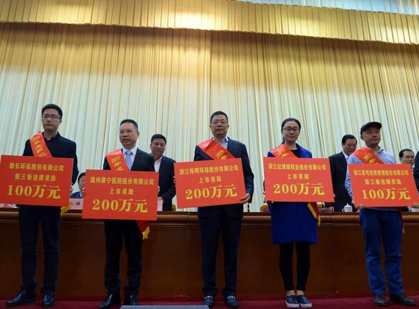 此外,大会还表彰了一批敢于拼搏、奋勇争先的优秀企业家及温商。项光明董事长作为其中的代表,获得了“2015年度温州市优秀企业家”荣誉称号及“第三届温商回归先进人物”称号,并代表股份公司登上大会领奖台,获得200万元的上市奖励。