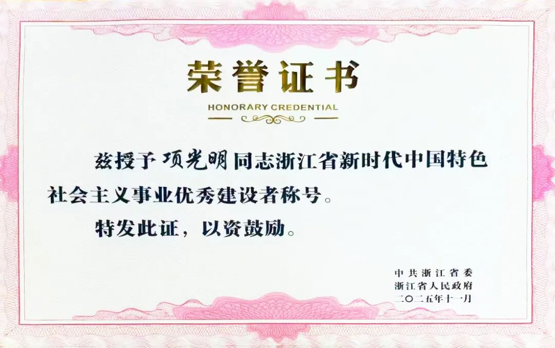 11月13日,浙江省新时代中国特色社会主义事业优秀建设者表彰大会在杭州隆重召开。大会表彰了全省各领域涌现出的杰出建设者,项光明董事长荣列其中。